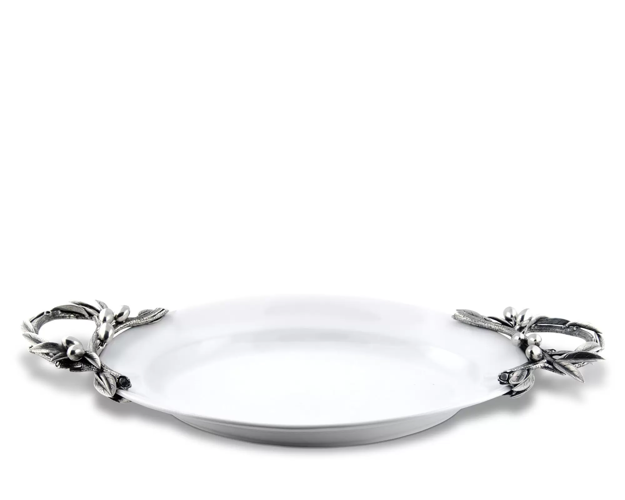 Керамическая основа отделана красиво обработанными ручками из оловянной посуды с изображением оливок, ветвей и листьев.