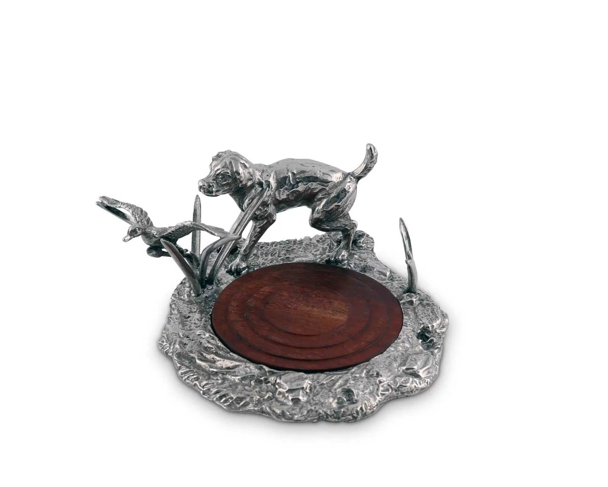 Чистый оловянный фигурный натюрморт из лабрадора и утки рядом с прудом из дерева акации, это судно под вино идеальный союз функциональности и формы. Замысловатая деталь это стиль подписи дизайнера Хелен Харрис Ричард.