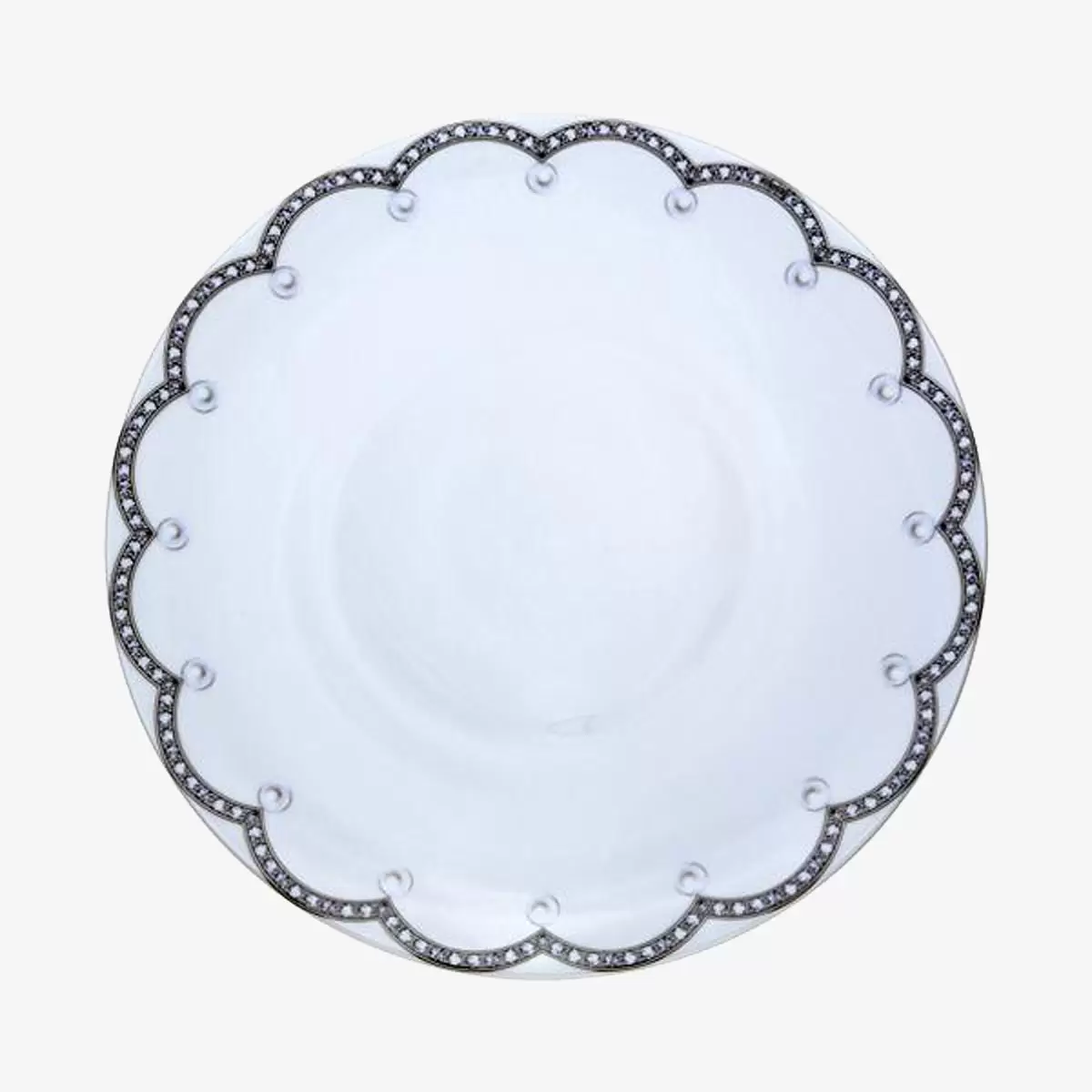 Материал: Лиможский фарфор. Виды и размеры тарелок: Большая «парадная» столовая тарелка (32 cm) Большая обеденная тарелка (27 cm) Десертная тарелка (21 cm) Суповая тарелка (19 cm) Тарелка для хлеба или масла (16 cm) Эту украшенную жемчужинами посуду, которая возводит эстетику оформления любой столовой на высшую ступень, в основном отличает изысканность и чистота форм.Характеристики: