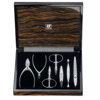 Инструменты выполнены из нержавеющей стали и чёрного акрила. Закалка холодом FRIODUR®. Сатиновая полировка. Эксклюзивный дизайн. Коробка изготовлена из эбонитового дерева.