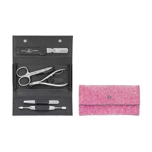 Набор состоит из: Инструмент двойной для отодвигания кутикулы и чистки ногтей Пинцет Кусачки для кутикулы Ножницы универсальные Пилочка для ногтей Футляр (150 мм х 80 мм) Материал инструментов: нержавеющая сталь FRIODUR® холодной закалки. Футляр розового (или черного) цвета с инкрустированными камнями Сваровски.