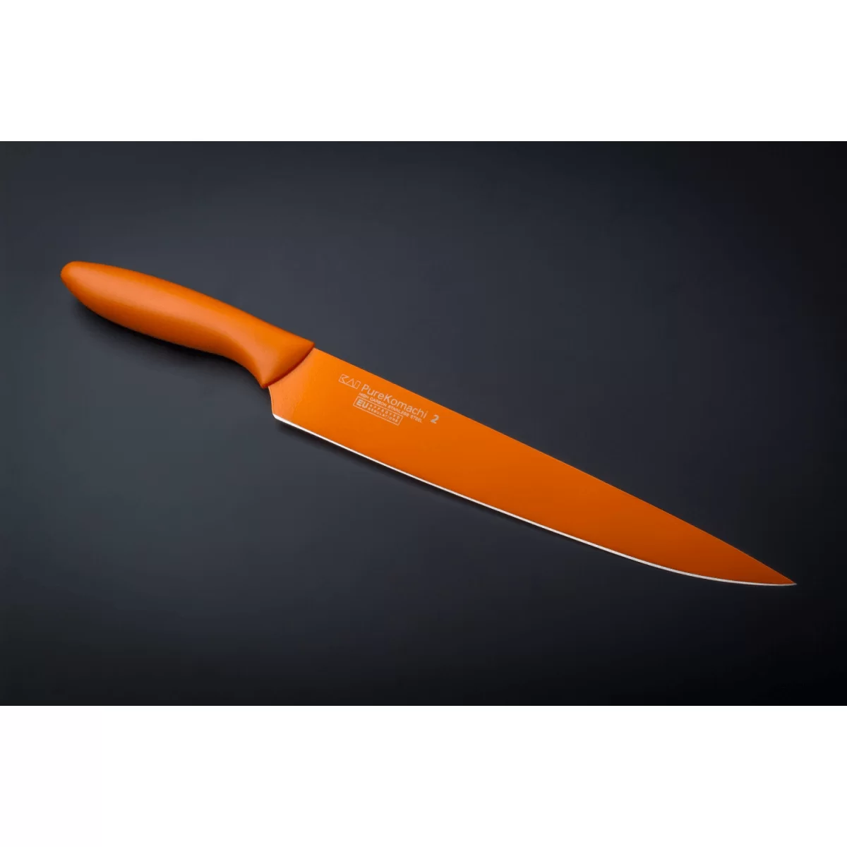 22,5 см Материал лезвия: нержавеющая сталь с оранжевым антипригарным покрытием. Режущая кромка: двухсторонняя Рукоятка: эргономичная ручка из высококачественного полипропилена. Нож для ветчины (Slicing) исполнен в оранжевом цвете и предназначен для нарезки мяса, как в сыром виде так и приготовленном, а именно для говядины, свинины и ветчины. Клинок ножа выполнен из высококачественной стали, имеет великолепный рез, остроту и цветное антипригарное покрытие в тон рукоятки, которое устраняет прилипание остатков продуктов к лезвию ножа, обладает защитой от коррозии, большой износостойкостью и практичностью. Разноцветность ножей серии Pure Komachi позволяет по цвету определить и быстро запомнить какой нож необходимо использовать для работы с определенными продуктами.Характеристики: